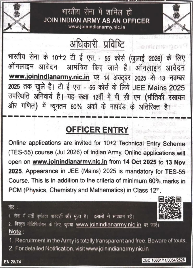 Note: The links provided above point to the official Indian Army website. Applications for Army 10+2 TES 55 Recruitment 2025 will start on 14 October 2025 and close on 13 November 2025. Only unmarried male candidates who have appeared in JEE Mains 2025 and passed 10+2 with 60% in PCM are eligible. SSB Interview dates will be notified soon. Always verify the latest updates on joinindianarmy.nic.in, as processes may change. (नोट: ऊपर दिए गए लिंक भारतीय सेना की आधिकारिक वेबसाइट की ओर इशारा करते हैं। आर्मी 10+2 टीईएस 55 भर्ती 2025 के लिए आवेदन 14 अक्टूबर 2025 को शुरू होंगे और 13 नवंबर 2025 को बंद हो जाएंगे। केवल जेईई मेन्स 2025 में उपस्थित अविवाहित पुरुष उम्मीदवार जो पीसीएम में 60% के साथ 10+2 उत्तीर्ण हैं, पात्र हैं। एसएसबी साक्षात्कार तिथियां शीघ्र अधिसूचित होंगी। प्रक्रियाएं बदल सकती हैं, इसलिए joinindianarmy.nic.in पर नवीनतम अपडेट सत्यापित करें।)